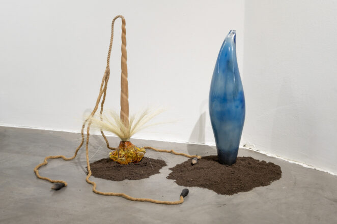 Sasha Tishkov „Tähtedest oleme tulnud ja tähtedeks me saame“. Installatsioon. Materjalid: puhutud klaas, puit, agaavikiud, nöör, muld, 60 x 20 x 20 cm, 2025.