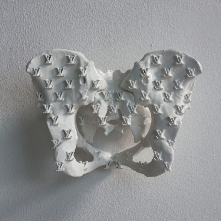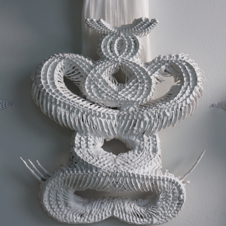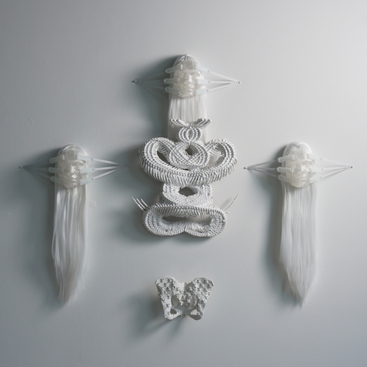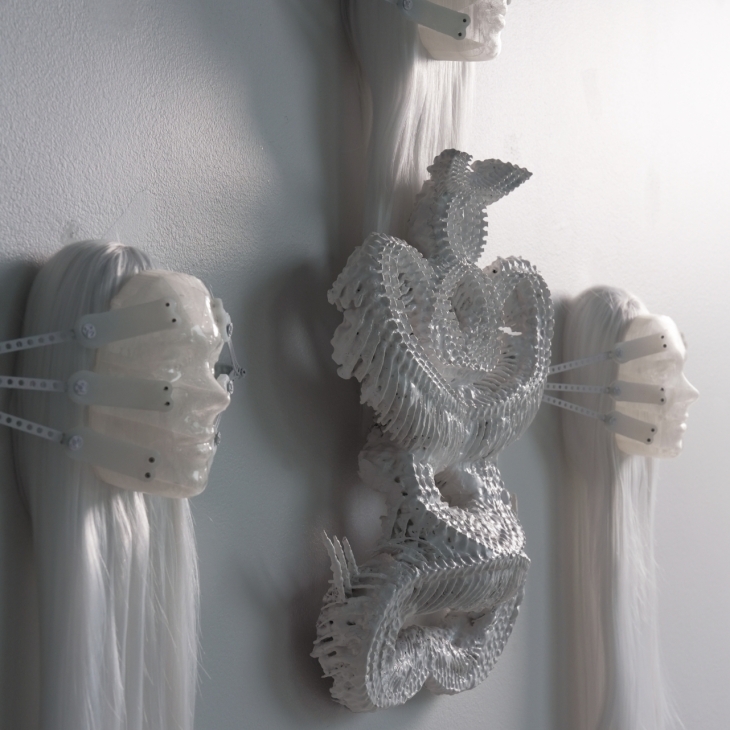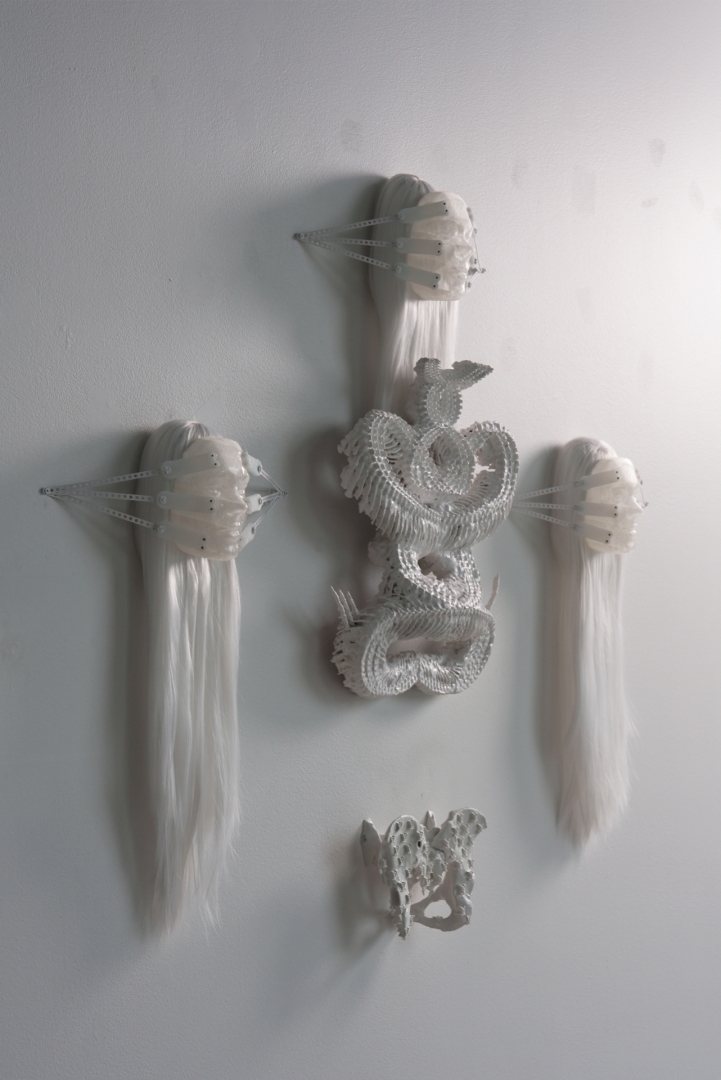 The wall-attaching sculpture Aesthetic archaeology consists of 3D scanned and printed objects, synthetic hair, and fasteners made out of silicone and metal. It draws inspiration from themes such as dialogue between the organic and artificial bodies, clinical body image and body modification in time and in the future.