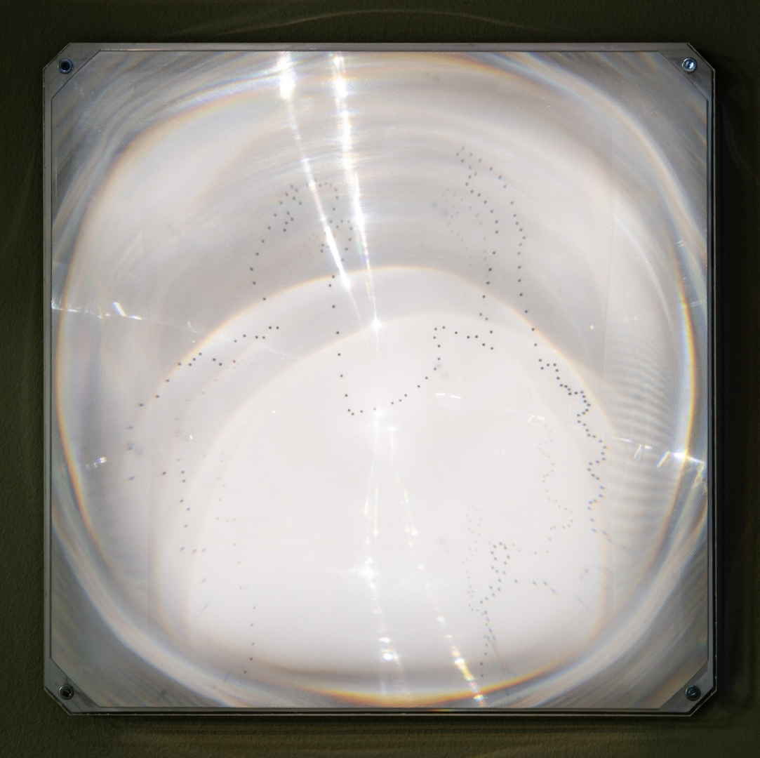 The overhead projector glass framing the work creates a subtly shifting, wave-like visual effect.