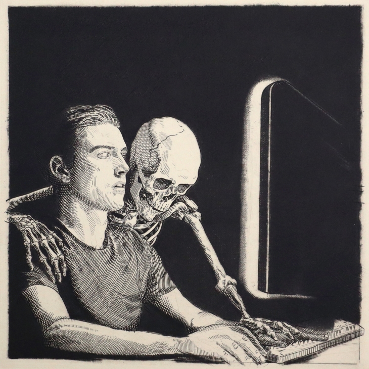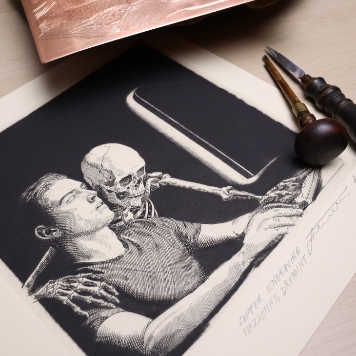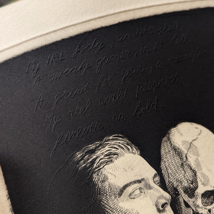 This is my original hand-pulled print, “Gamer.” With this piece, I wanted to explore the intense relationship between our digital lives and the unstoppable passage of time, a theme I’ve experienced firsthand. I used a combination of copperplate engraving, mezzotint, and drypoint to create the stark contrast and intimate mood I envisioned. My Inspiration and Intent: I designed this scene to feel both intimate and claustrophobic. A young man is lost to his screen, but he’s not alone. For me, it was crucial that the skeleton wasn’t just a passive observer. I posed him as a silent guide, his arm draped over the gamer’s shoulder and his hand close to the keyboard, as if subtly influencing every click. He is the physical embodiment of time itself, whispering the temptations of “just one more game” as our real lives wait. This print is born from my own memories of spending entire school breaks on 16-hour gaming marathons. It’s a reflection on that grind—the hunt for XP and gear—and a question of what was truly gained while so much time passed by. A Hidden Message: To leave no doubt about my message, I engraved a short poem directly into the copper plate, hidden within the velvety black of the background: “My IRL body, an NPC shell, A sweaty gamer, in XP hell. A grind for gear, a meaningless goal, My real-world progress, forever on hold.” This work is my call to action: a reminder to focus on our progress in the real world (IRL). To put energy into our health, our minds, and our skills. To become a slightly better version of ourselves each day. Details: Title: Gamer Artist: Reinis Gailītis Year: 2025 Techniques: Copperplate engraving, mezzotint, drypoint Ink: I use high-quality, oil-based intaglio ink. Paper: Printed on archival, heavy-weight cotton paper. Edition: This is a limited edition of 150 prints. Signature: I personally hand-pull, title, number, and sign every print. Please note: Because I create each print by hand, there will be minor variations in the inking, which makes every piece a unique work of art. Gamer, Copper Engraving, Mezzotint, Drypoint, 2025. Print size 20x20cm, 7.9×7.9in paper size ~23x23cm, 9x10in. Printed on Hahnemühle Copperplate 300gr “Antique” German mould-made archival quality paper.