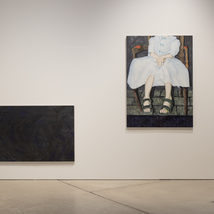 I have tried to listen to silence. Sometimes silence comes across by chance; during winter frost by a field, in between a lightningbolt and a thunderclap, or in the deep shadows of baroque paintings. I don’t know how to describe silence in words. Silence keeps taking its shape in liminality; in both its spatial and psychological forms. In places lost and bypassing. It is in between of celestial and sad, luminous and dark. In the question when it is silence and when being silenced. The occurrences on no one’s land, things not happening, things unreachable. Lost identity finding its form and a try out to be present now. In my body of work I strived to create room for visual silence inside the Gallery space. With installation choices I created a zone that invites the viewer deeper into the space of the paintings. Colors darken towards the corner, and the void in the paintings becomes more reachable, a space to almost step into. I think of painting as an extension of the body. Paintings themselves are shadows cast of the feelings, observations and thoughts experienced during the act of painting. Researching tenderness and elegiac travel alongside my artistic work. I have painted the series of four large scale paintings mainly with dark tinted oil paints on linen canvas.