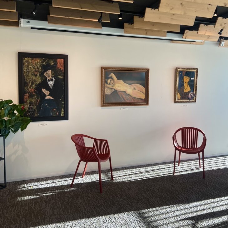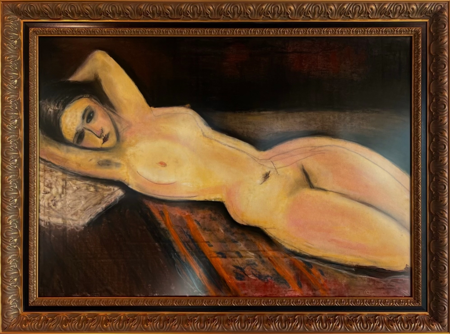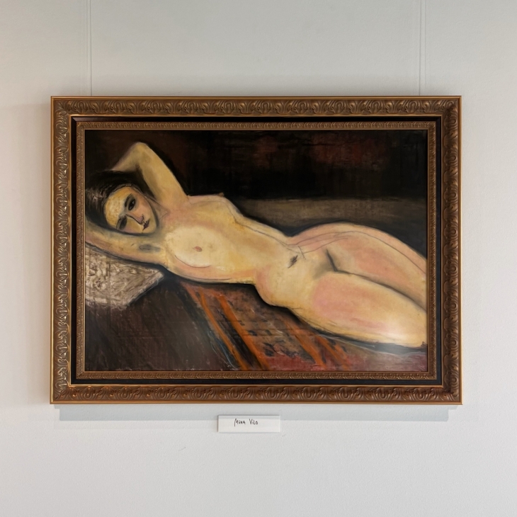 The size includes the frame. Matte glass. The piece is on view at the international group exhibition “Modigliani, My Love” at the Hiiumaa Windtower Experience Center until December 5th 2025. The group exhibition is dedicated to the 141st anniversary of Amedeo Modigliani’s birth. Curator: Ewa-Kaisa Plakk.