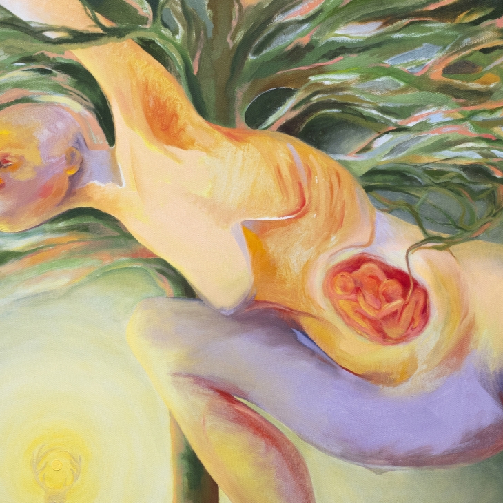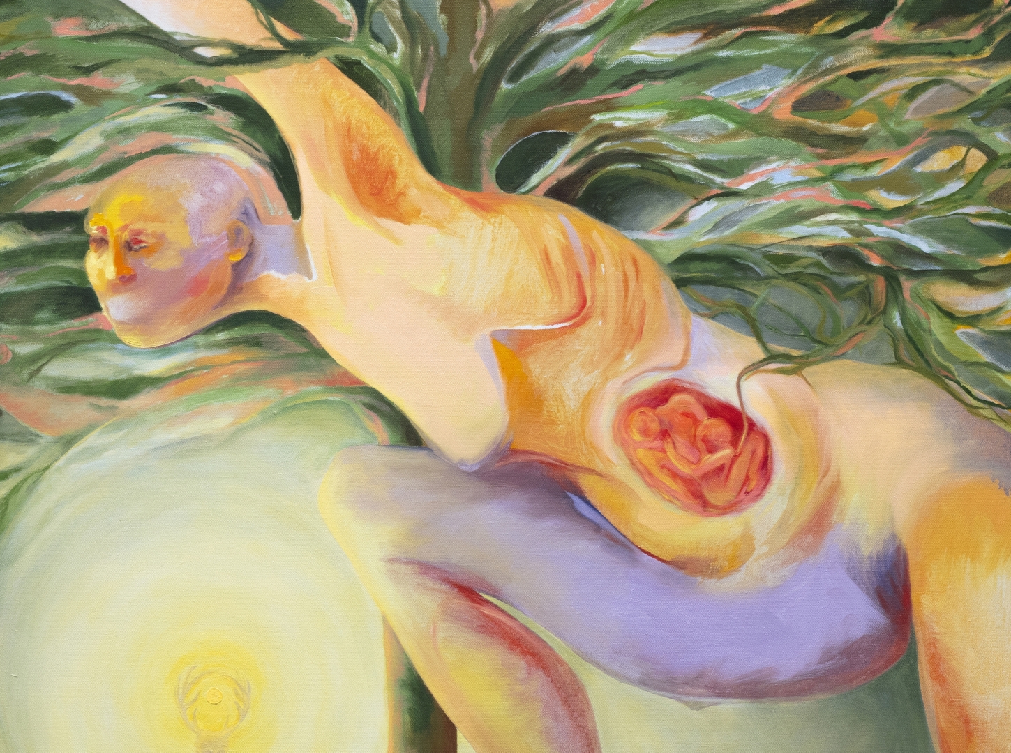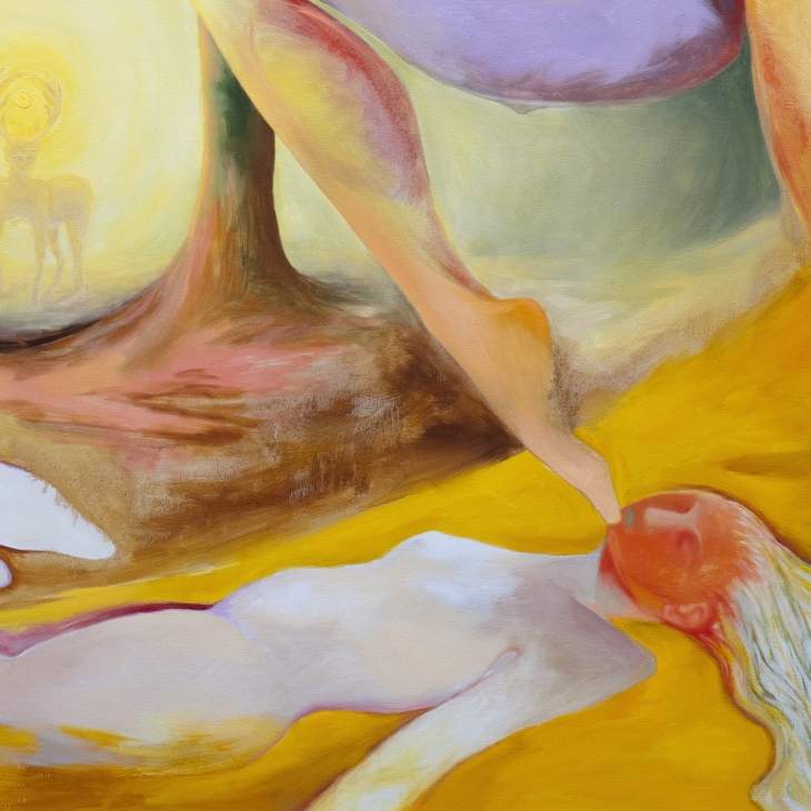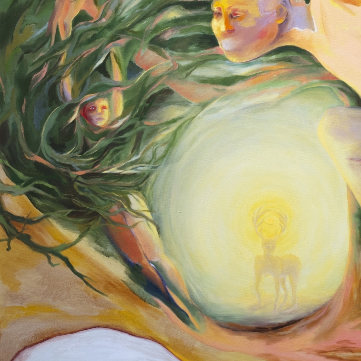 “Hunor and Magor in the Womb” is an ode to origin myths, and to creation in general. Hunor and Magor, sons of Enéh, ancestors of the Huns and Magyars, were led to their new land by a deer (often depicted with the Sun between its antlers). The name Enéh is derived from the word ünő, meaning a hind in Hungarian. My painting doesn’t tell this tale, it freely wonders about what surrounds, predates and follows it. It wonders about the origins of one who is believed to have created the beginning. The work has been displayed in the BFA exhibition of The Academy of Fine Arts, Helsinki, 2025. (12. Sept. – 5. Oct.)