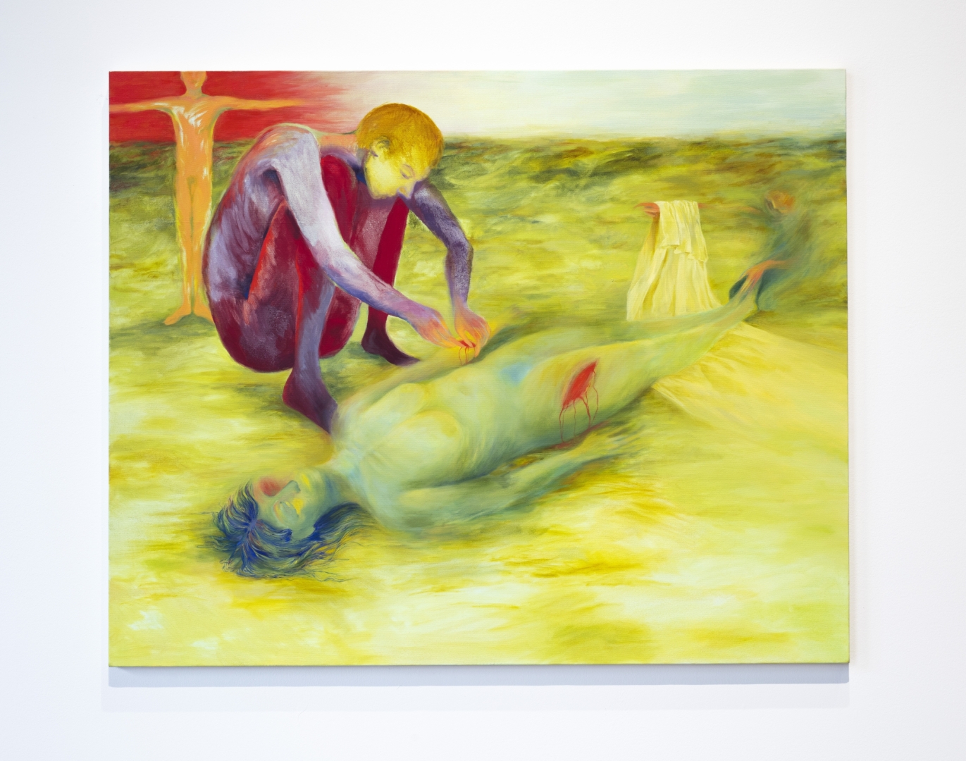 “In between leaving and returning” is how I imagined the brink of death, but with a happy ending. I thought about a resurrection, whether it could be felt without really dying, turning back at the station between life and death. In other words, it is a meditation on healing, and its tranquillity. Narrated by vivid colours and four characters. The work has been displayed in the BFA exhibition of The Academy of Fine Arts, Helsinki, 2025. (12. Sept. – 5. Oct.)