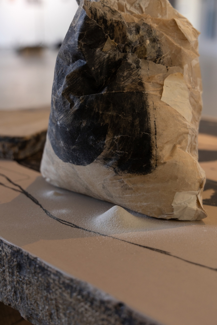 I printed lithography on japanese paper that i then folded to a bag and made a wash to it with liquid gum arabic to make it look more like a brown paper bag that contains carborundum sand, used in the process of graining the lithostones. I wanted to make some material studying with this piece related to printmaking process and its mediums. Also i had curiosity, that how much weight this kind of paper can hold as a paper bag, in the end the bag started leaking and the sand made these kind of dunes on the lithostone installation in the NYTT-2025 exhibition.