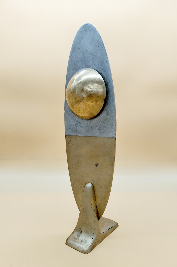“A bronze and aluminum sculpture depicting an abstract “moonrise” – the emergence of light and form. The work is cast using a multi-stage metal casting technique, combining bronze and aluminum into one harmonious form, emphasizing the rhythm and balance born from the two metals.