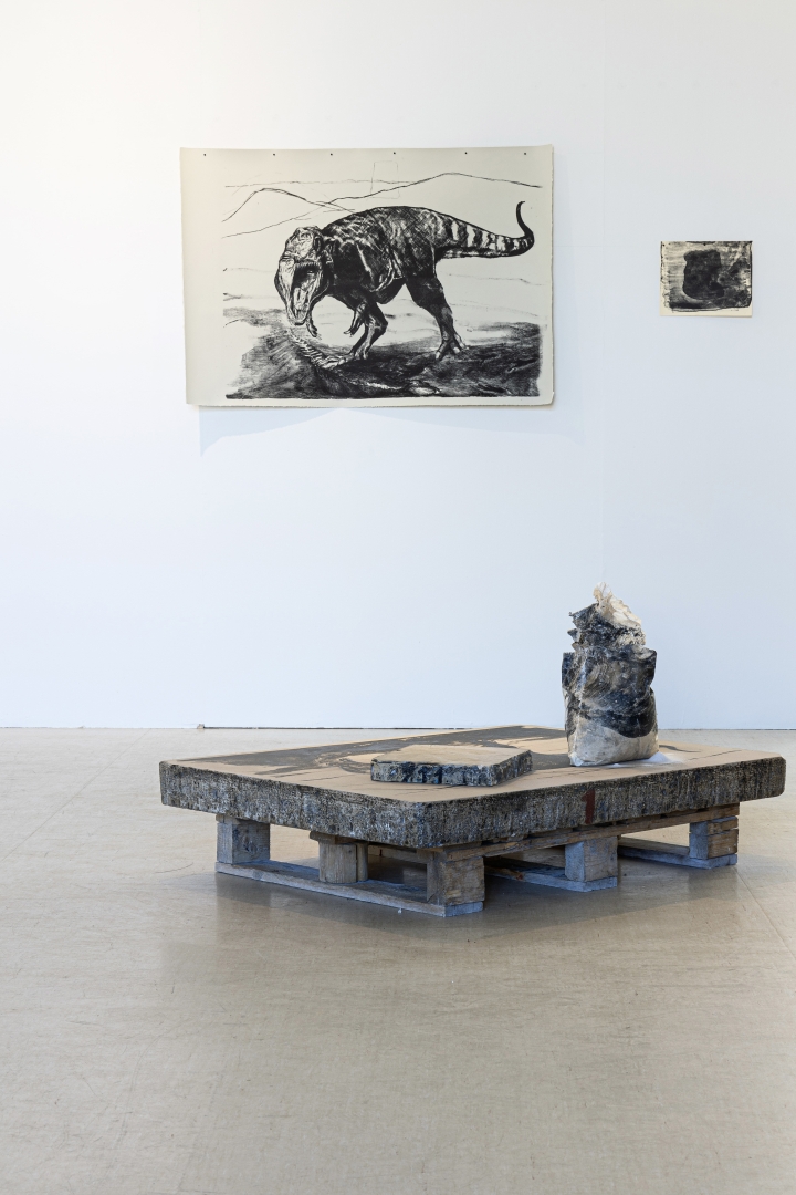 I wanted to bring lithographic process more visible to the viewer by showing the plate 300kg limestone with post printed image on it, drawing on the stone represents a dinosaur like creature, for the lithostone is practically a fossil made from sea animal shells and exoskeletons that died millions of years ago. therefore an ancient animal is interesting subject to draw to the stone, also it has this kind of sci-fi camp aesthetic that i liked to study with a drawing.