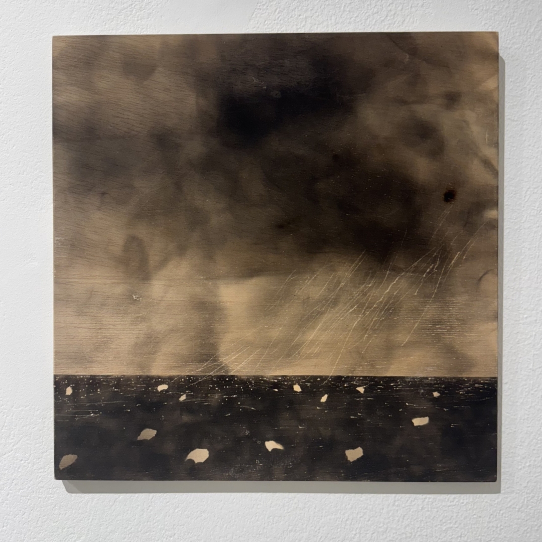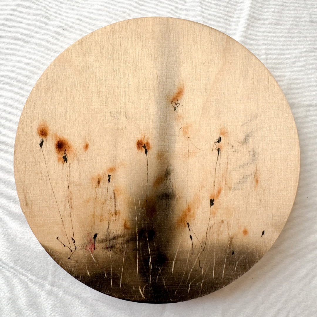 The artwork is created using unique fire techniques developed experimentally over the past four years. This method allows for a partial control of the visual outcome, creating textures in varying shades or intricate, sometimes relief-like details. It is a layered process—akin to glazing with fire—paying homage to the core principles of painting while celebrating its transformative power. ‘The silky, warm surface of birchwood cradles memories of the sun’s touch, of faraway fields, forests, nature. Each fiber line and branch scar breathes calmly until the flame appears, altering the rhythm and the matter itself. Fire becomes a co-creator, leaving its sfumato traces where it prefers, just sometimes yielding to the wood and the artist’s intent. It’s paradoxical, as one might think that these inner landscapes, shaped by burning, would become more fragile. Yet, the charred surface gains resilience, resisting the impact of the surrounding environment. This is an alchemical path to the core, where the flame acts as both detonator and the mean of motion.’
