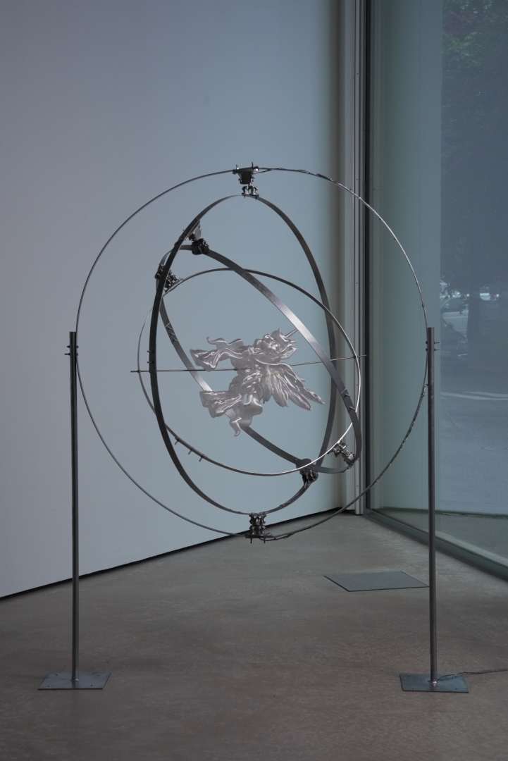 Right round consists of aluminium hoops that rotate inside each other powered by servo motors and slip rings. In the middle of the hoops is attached a transparent, muscly unicorn. The work draws on themes from pop culture phenomena, kinesthetics and optical illusions.