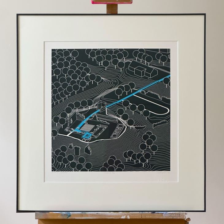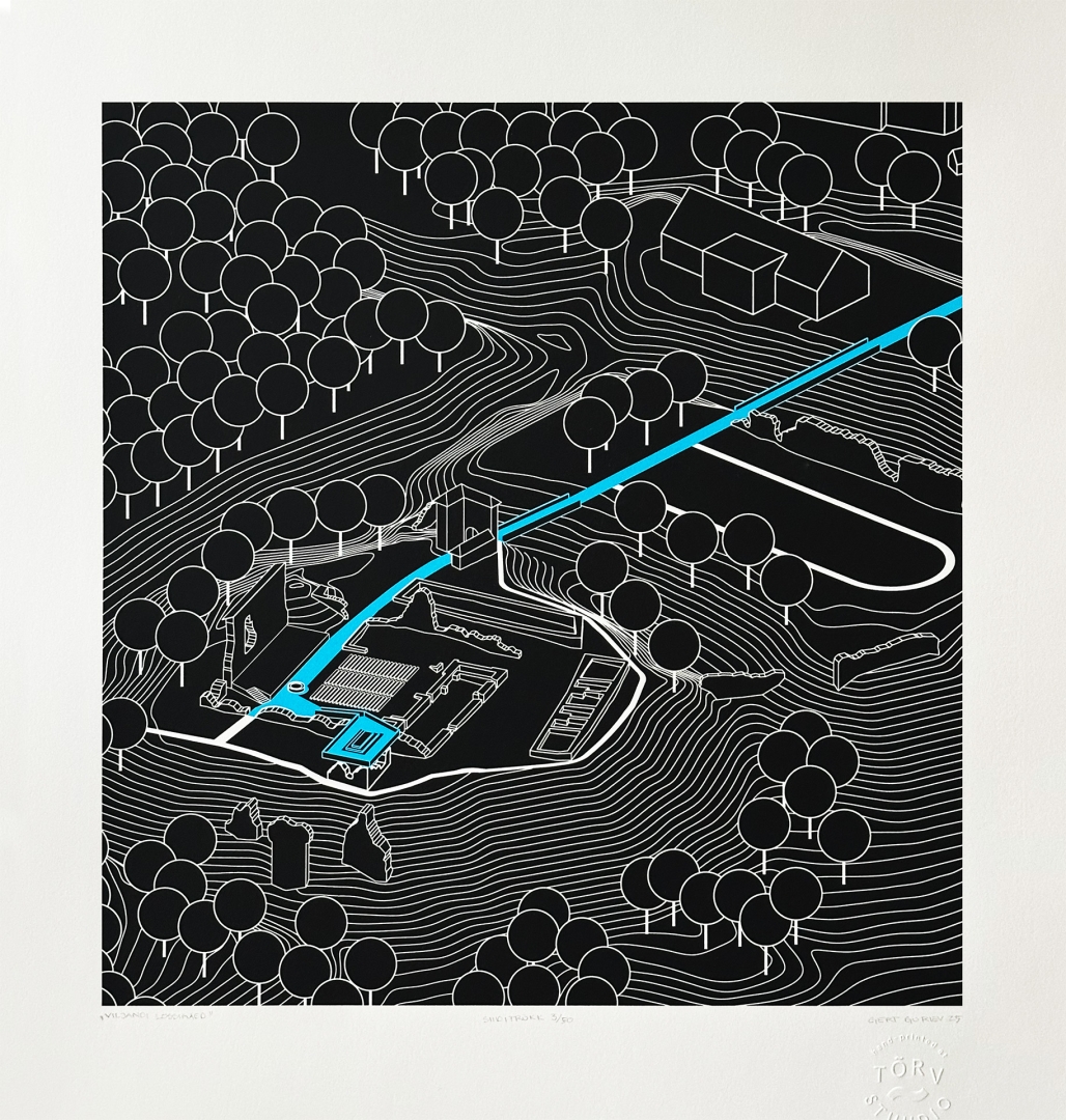 An isometric graphic shows the Ruins of the Viljandi Order Castle – a unique ensemble of landscape and history and the city’s most important landmark – together with the winning entry of the 2023 architectural competition “Viljandi Castle Hills Visitor Environment”, designed by 3+1 Architects, with Guriev as one of the authors. On the black-and-white terrain, a new route is highlighted in blue derived from the colour of Viljandi’s flag, linking the hills with a series of bridges and ending at a viewing platform on the roof of Villu Cellar, overlooking Lake Viljandi.