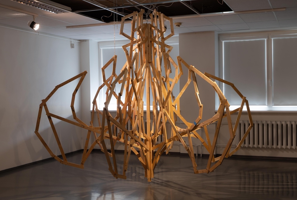 The work is made from inexpensive construction timber, creating a dialogue between the form of the object and the associations related to its material. Sketches, technical notes and brass screws are visible on the wooden surface; instead of the crystals typical of chandeliers, these elements relate more naturally to the simple building material used.