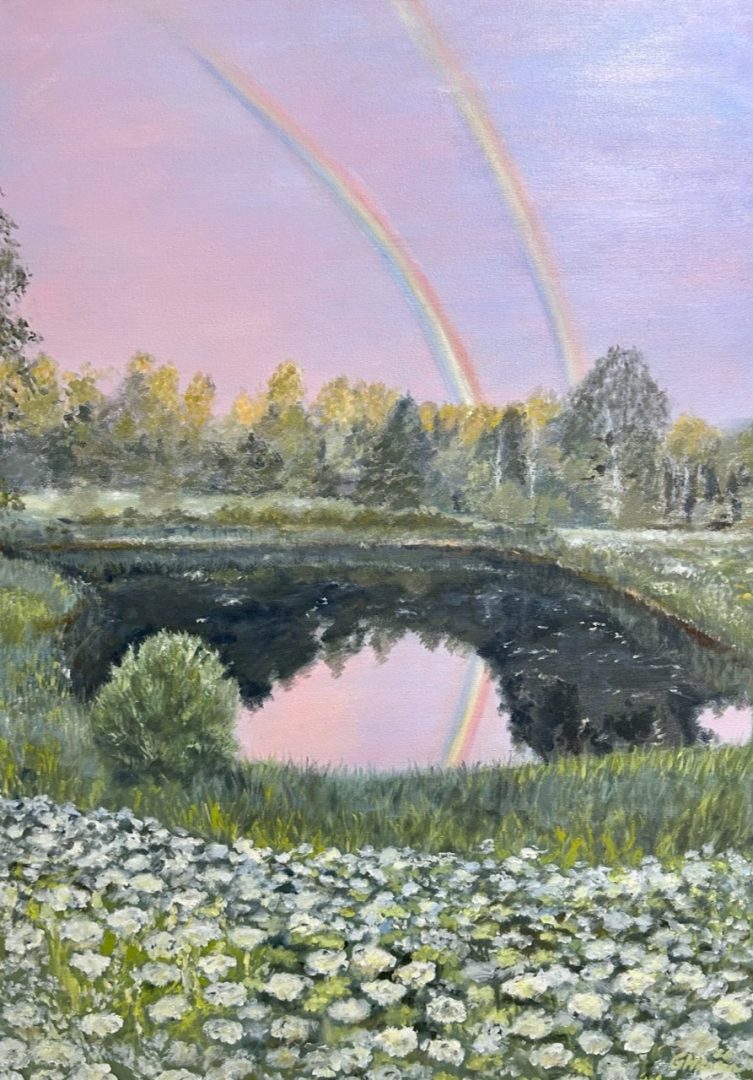 Roosa päikesetõusu, õrna vihmasabina ja kahe vikerkaarega jäädvustatud hommik.