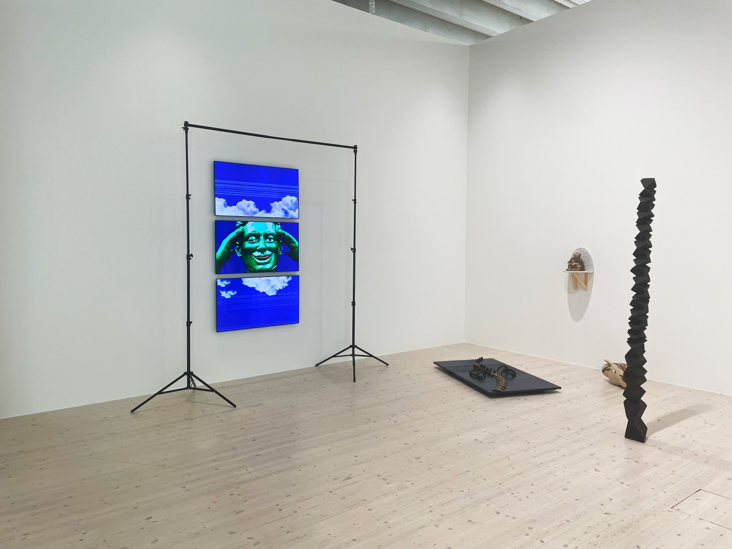 The Rot is a three-channel video installation exploring what happens when digital systems break down—when artificial beings, created through generative technology, lose their connection to meaning, structure, and source. The work consists entirely of AI-generated voices, stock imagery, and synthetic animation. There are no filmed or physical elements—just digital remnants speaking into a void. Each screen presents a digital entity stuck in a blue-screen environment, referencing the Blue Screen of Death common in system errors. These characters try to communicate, loop through familiar phrases, and search for input— spewing out lines like “something went wrong” or “describe the image you want to generate.” While these phrases come from tech interfaces, They are, in this context, used as stand-ins for deeper existential questions—about identity, control, and the systems we depend on. The way these entities slowly melt into green “slop” reflects the overload of low-quality content we see online, but also speaks to a more general fatigue: of ideas, of futures that never came, of a world that feels increasingly automated and stuck in place. (DISCLAIMER: The sculptural work on the right is not a part of my video installation.)