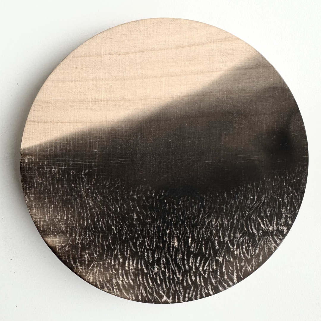 Tondo shape. The artwork is created using unique fire techniques developed experimentally over the past four years. This method allows for a partial control of the visual outcome, creating textures in varying shades or intricate, sometimes relief-like details. It is a layered process—akin to glazing with fire—paying homage to the core principles of painting while celebrating its transformative power. ‘The silky, warm surface of birchwood cradles memories of the sun’s touch, of faraway fields, forests, nature. Each fiber line and branch scar breathes calmly until the flame appears, altering the rhythm and the matter itself. Fire becomes a co-creator, leaving its sfumato traces where it prefers, just sometimes yielding to the wood and the artist’s intent. It’s paradoxical, as one might think that these inner landscapes, shaped by burning, would become more fragile. Yet, the charred surface gains resilience, resisting the impact of the surrounding environment. This is an alchemical path to the core, where the flame acts as both detonator and the mean of motion.’