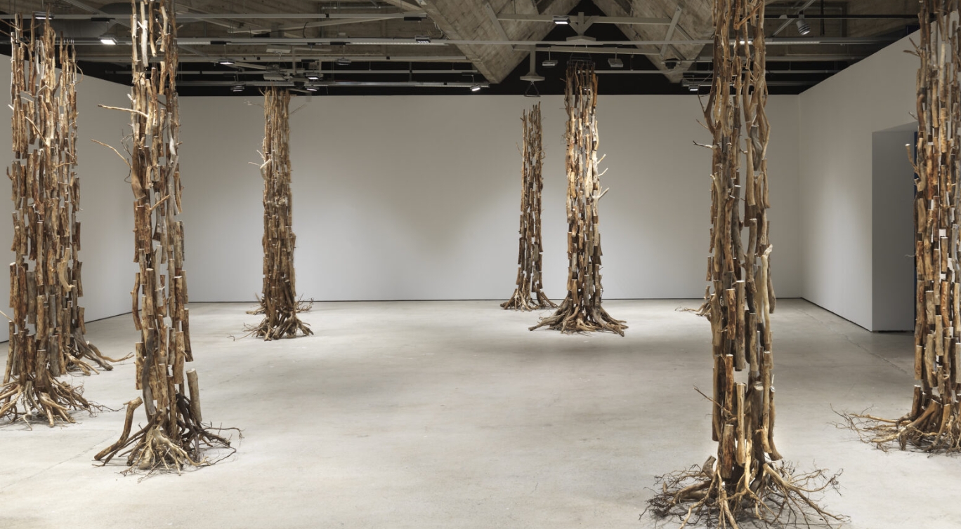 The Roaring Forest (2025) is a kinetic installation that provokes reflection on the human ability and means to shape nature. The installation is assembled from wooden material found in different parts of southern Finland. It includes both twigs left in logging areas and the rhizomes of windfalls found in the forest. These trees, which have broken down in various ways, have been reassembled in the work into different types of trees and arranged into a forest. This creates a man-made landscape, to which mechanical mechanisms give life and sound.