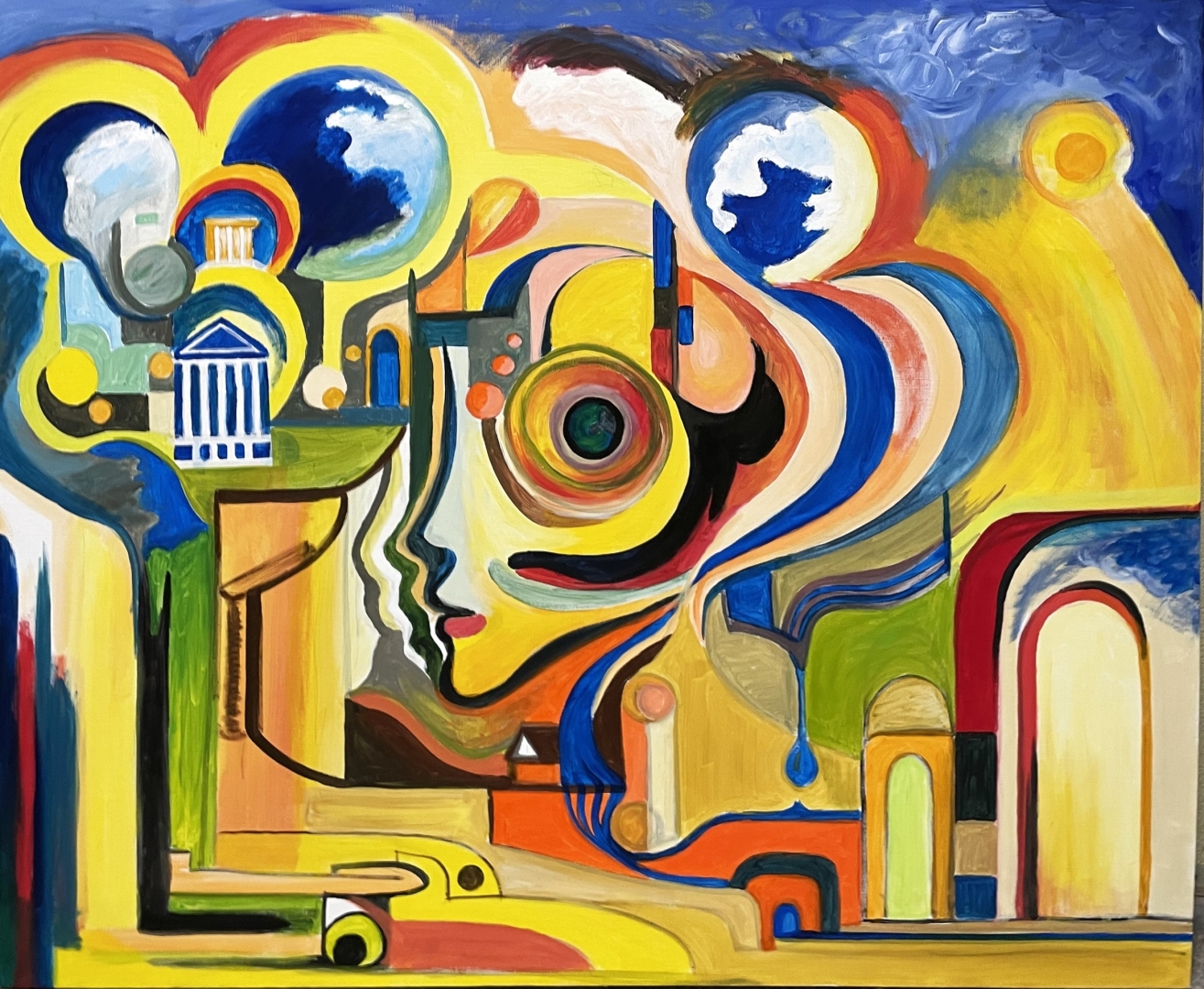 Teos kujutab sisemaailma ja ruumi sulandumist. Inimnägu ei ole portree, vaid vaatepunkt – teadvus(unenägu), mille kaudu linn, arhitektuur ja kosmilised motiivid end lahti rullivad. Vormid voolavad näost välja ja tagasi, justkui oleks mõte muutunud maastikuks.