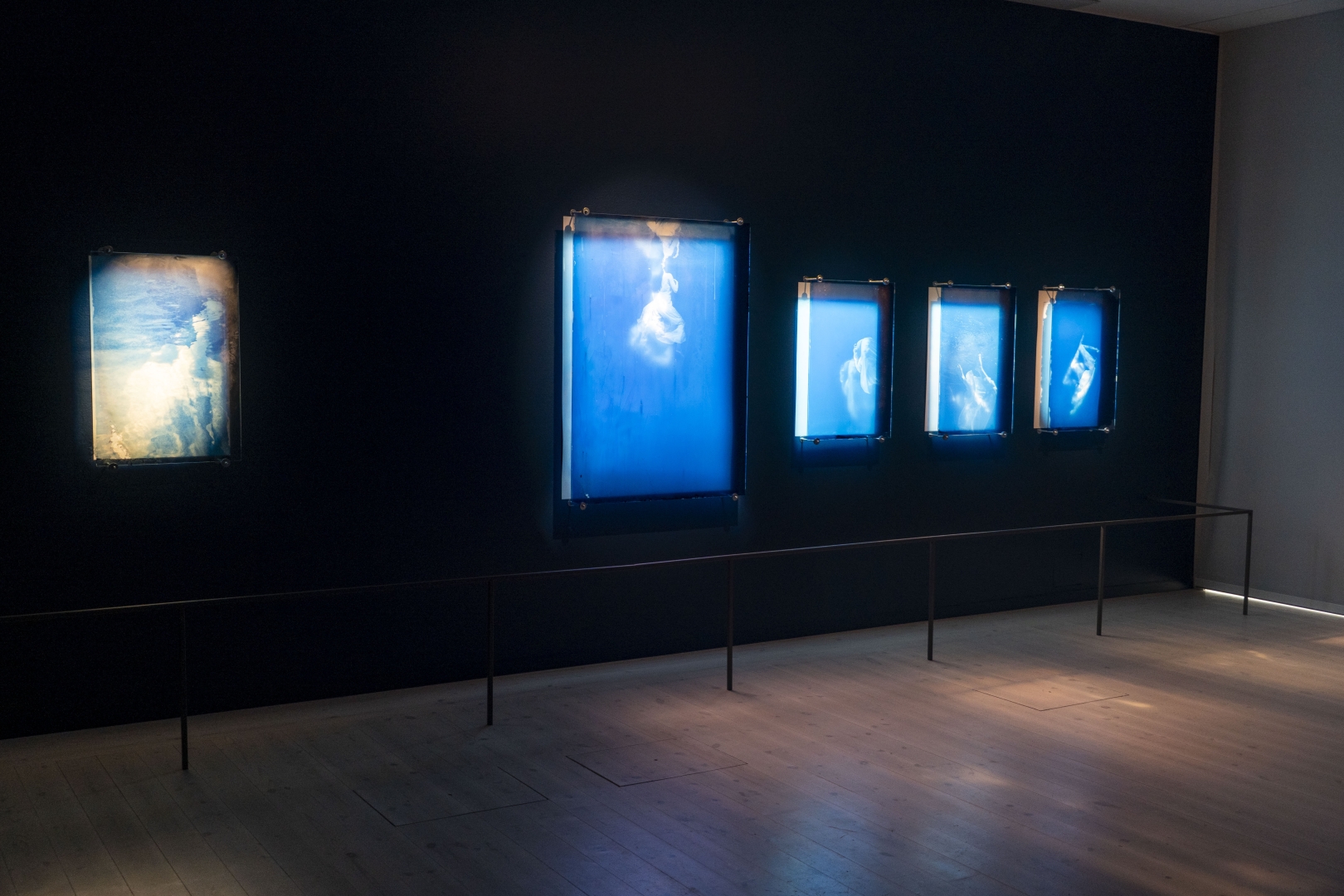 This installation is a visual representation of a place that once held deep meaning for me. Even after I left, I kept the memory close, preserved in its own way. As I got older, I began to forget the place that had meant so much to me. The place still exists, but it no longer holds the same importance it once did. I find myself revisiting moments rather than truly living them again. This work lives in that in-between space: the version of the place that moves on without me, and the one that lives on in my heart. This is a series of 5 cyanotype printed on glass plates, the smaller ones are 67cm by 45cm and the large one is 110cm by 80cm. The process is cyanotype on glass which is a difficult and advanced process which requires patience, skill and experience. I mounted the images 10 cm away from the wall which gives the image movement due to the shadow produced by the plate and overhead light. This project has been awarded the Region Västerbotten (Alva Gallery) scholarship and is exposed in Bildmuseet (one of Sweden’s foremost venues for international contemporary art) for the summer.