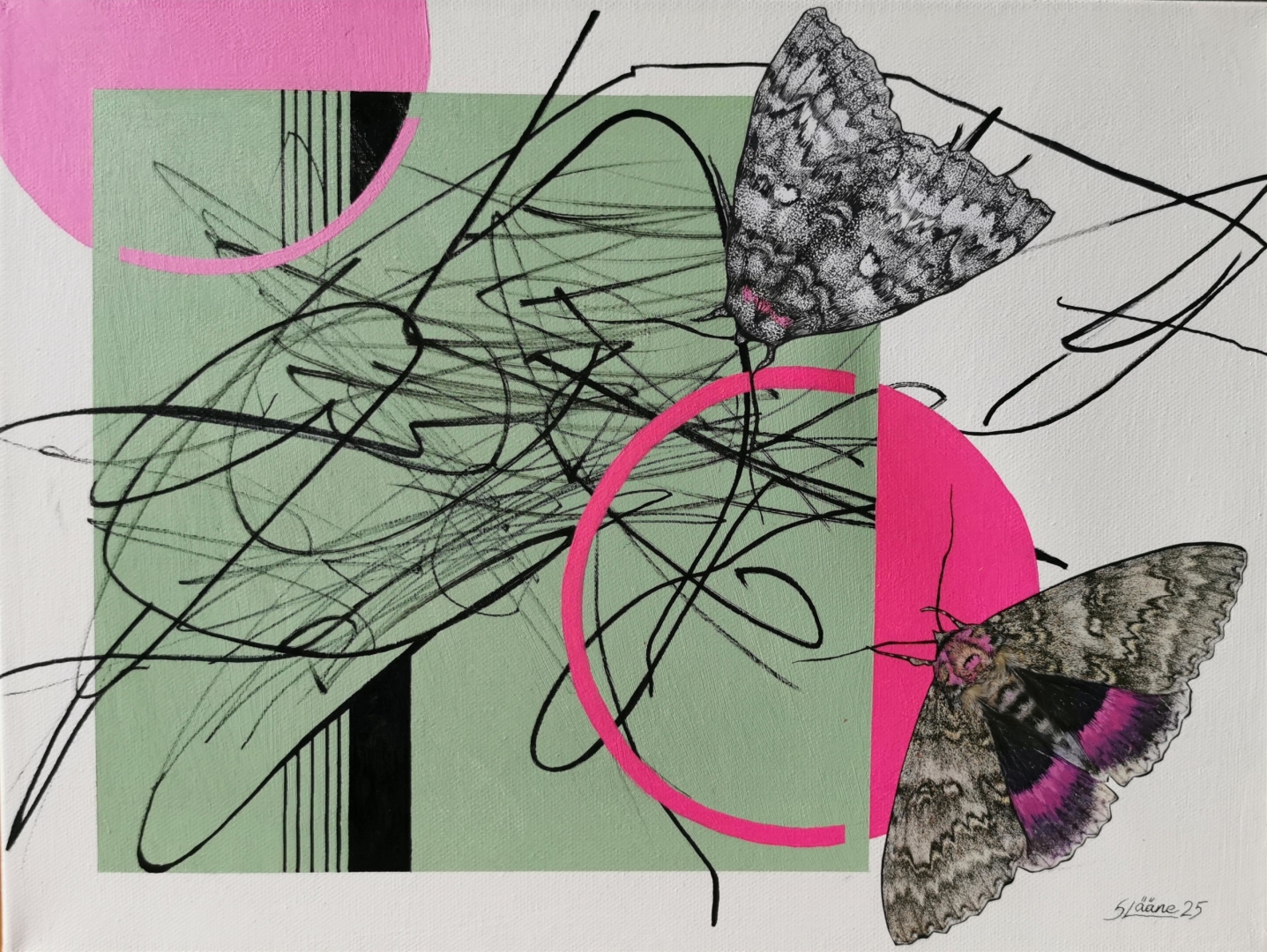 Lõuend raamil, akrüülvärv, markerijoonistus, ajalehe väljalõiked.
