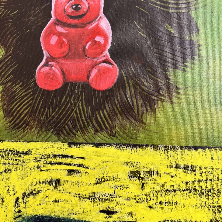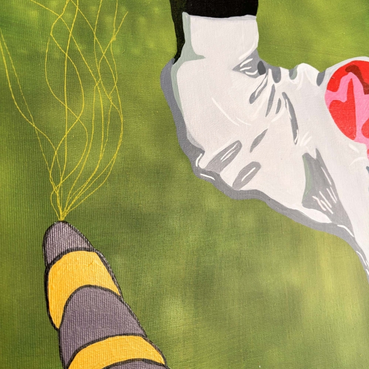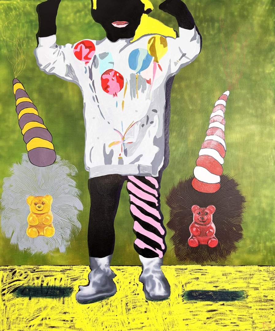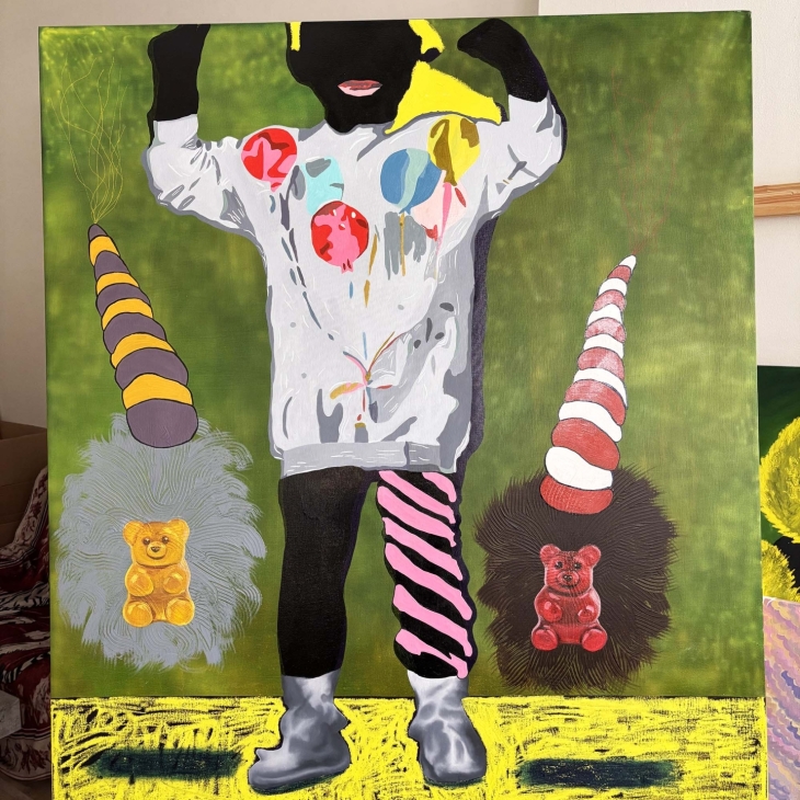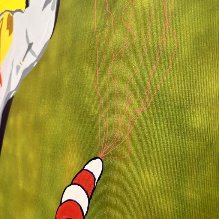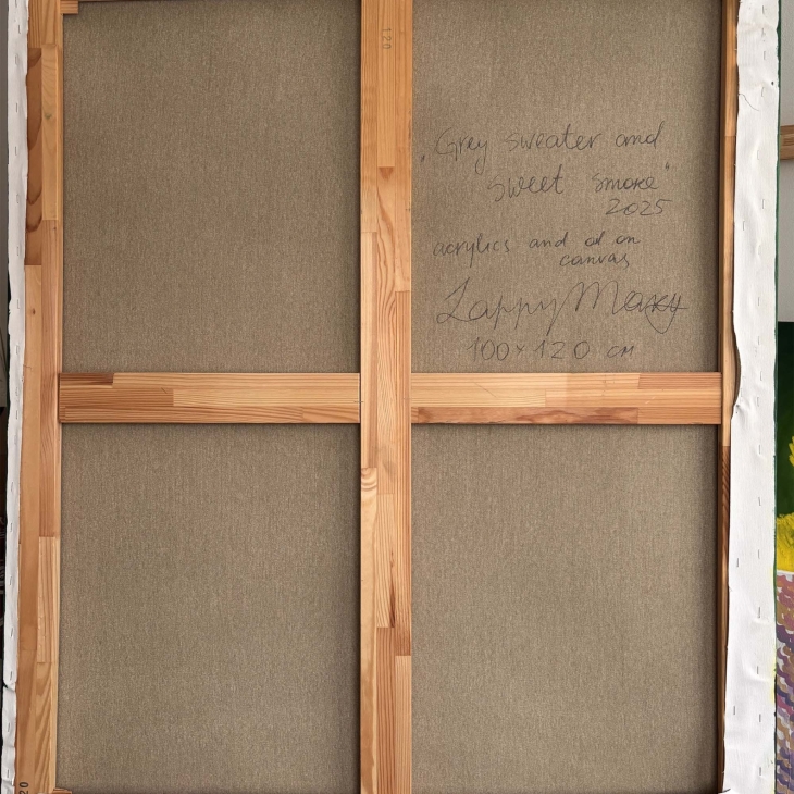 Maali kompositsioon on kokku pandud justkui pidupäevaks – hajali märkidest, mänguasjadest ja kaitsvatest kihtidest. Nende funktsioon ei ole kaunistamine, vaid kaitsmine – need pole mõeldud vaatamiseks, vaid selleks hetkeks, kui astutakse välja, ajal, mil lapselik pidulikkuse tunne toimib veel kaitsevormina.