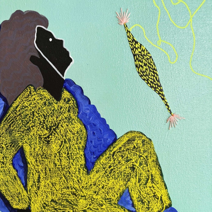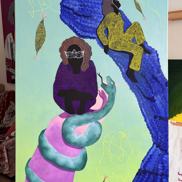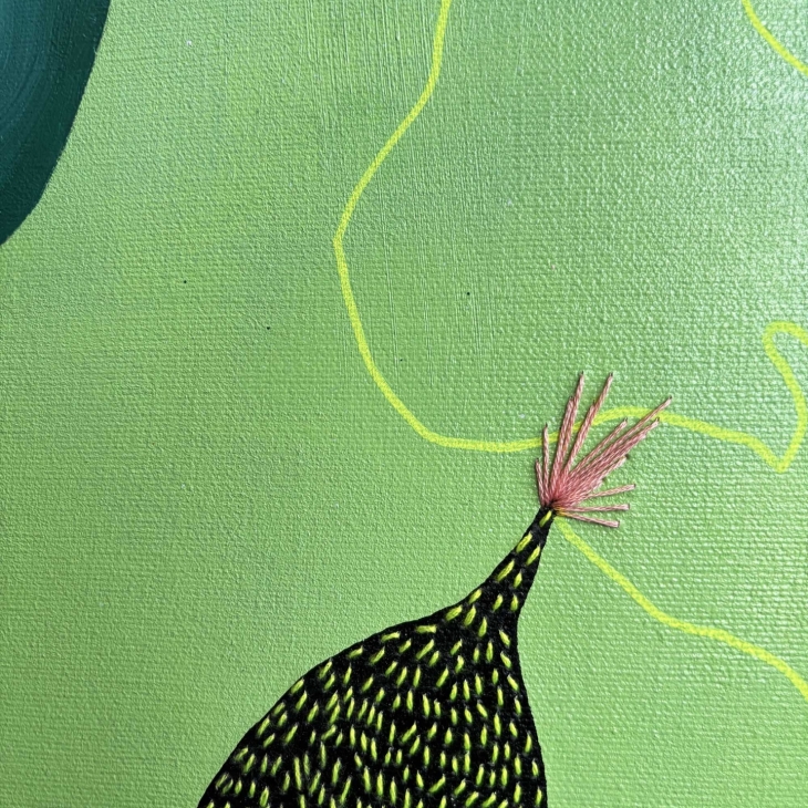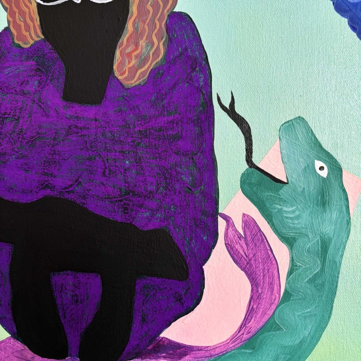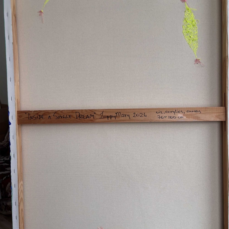 See on õli- ja akrüülmaal, millel on mõned tikitud detailid. Figuurid eksisteerivad ühises unenäoruumis, kus toetus on voolav ja kehad vabanevad harjumuspärasest loogikast. Siin ei ole sündmusi ega hierarhiaid – on vaid aeglane kohalolu seisund, milles kujundid tekivad, hoiavad üksteist ja liiguvad edasi ilma ajalisest eesmärgist lähtumata.