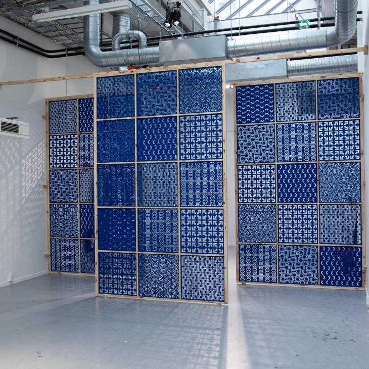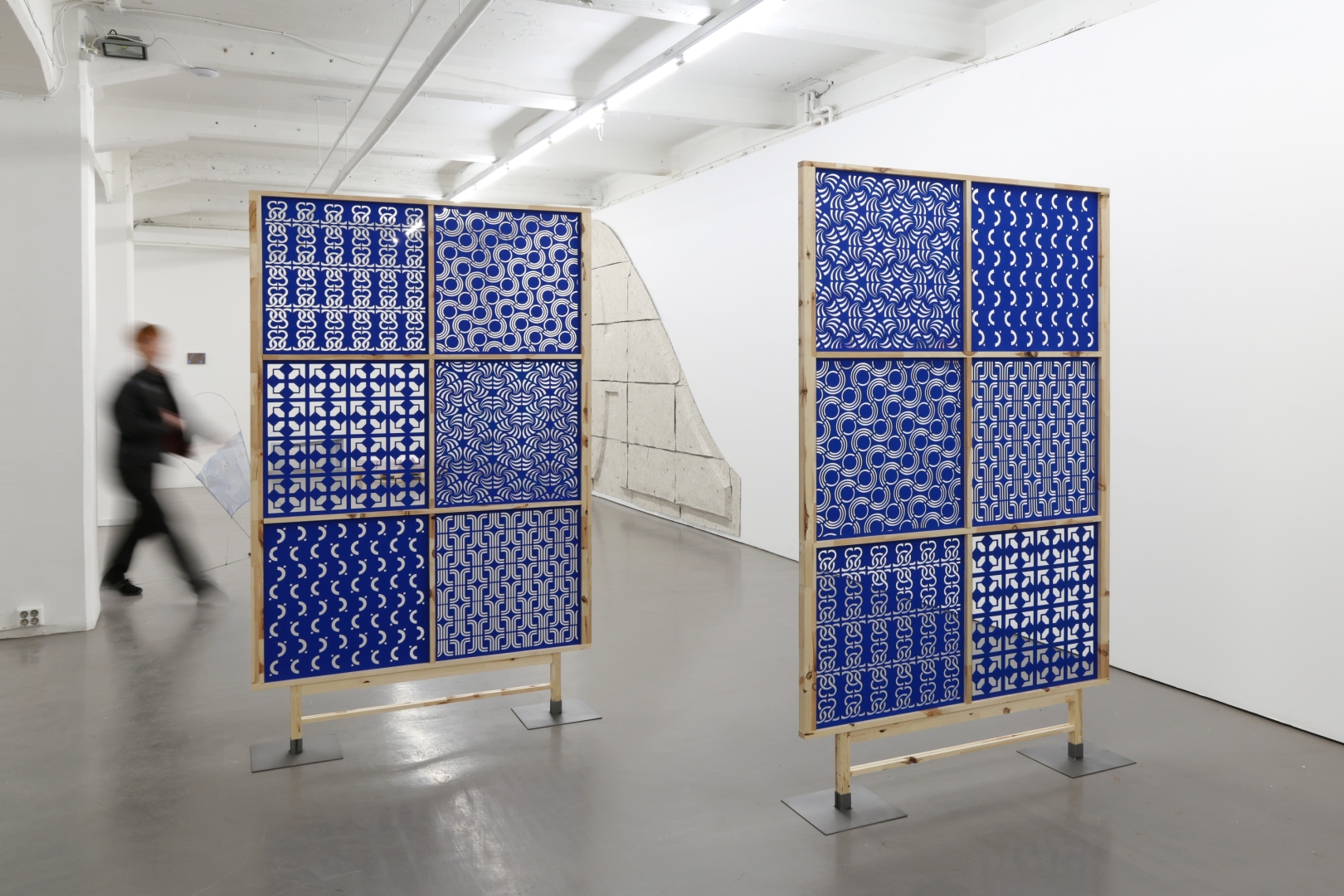 Partition is a modular work composed of laser-cut MDF panels, held together by a wooden framework. The cut-out patterns are derived from repetitions of government agency logotypes, which at once signal authority and dissolve into a tangle of forms. The work moves between structure and dissolution, clarity and confusion. In developing Partition, I have been reflecting on the role of visual design in communicating power. The logotypes operate as symbols of institutional control, yet lose their authority as they break down into abstract, decorative patterns. The first iteration of the work was shown in my solo exhibition To Cut a Long Story Short at Konstfack in February 2025, where it took the form of three monumental partition walls that guided movement into the gallery space and confronted viewers as both obstacle and passage. A second iteration was presented at Konstfack’s Spring Exhibition at Platform Stockholm in May 2025, reconfigured into smaller, movable screen walls.