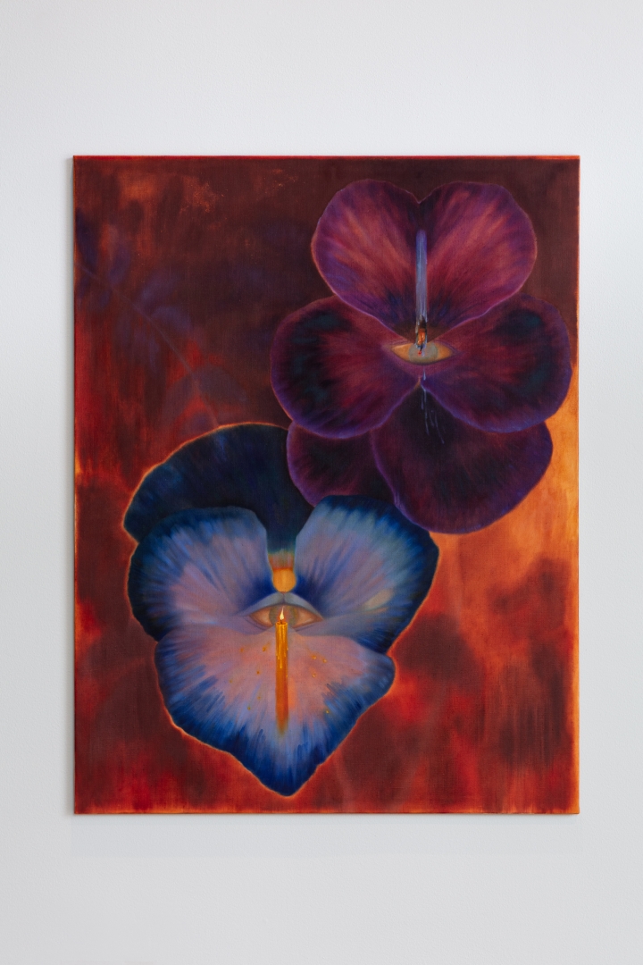 Oil, alkyd and beeswax on linen There are eyes in the center of the flowers, and in front of the eyes are the burning and extinguished wicks of the candles. Stearin has dripped from the candles onto the petals. I draw inspiration from the way the heart of a pansy glows like a flicker of fire — delicate yet radiant. The work has been in the Kuvan Kevät MFA Show as part of my series of ten paintings. The series of works was exhibited from 7 May to 15 June 2025 at the Kuva/Tila gallery of the Academy of Fine Arts in Helsinki.