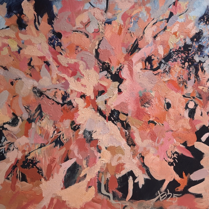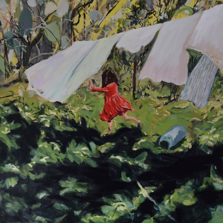 The work was created using a screen printing technique and then oil paint. The content draws attention to things that are not immediately noticeable, such as in this painting, What are we eating?