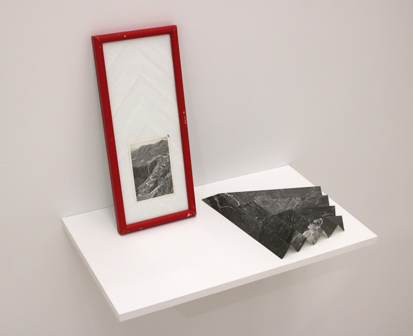 Through this arrangement of found objects (altered and reconfigured by hand), I continue my engagement with themes of distance, contiguity, and placement/ displacement. A found photograph of a mountain trail full of bends is juxtaposed with a cutout of an aerial view of the earth (folded by hand in a repetition of “mountain” and “valley” folds) to comment on how one can lose one’s place geographically (through migration and displacement), but also in a narratological sense, for example by getting lost in a trail of thought, a mental thread, or in someone else’s point-of-view.