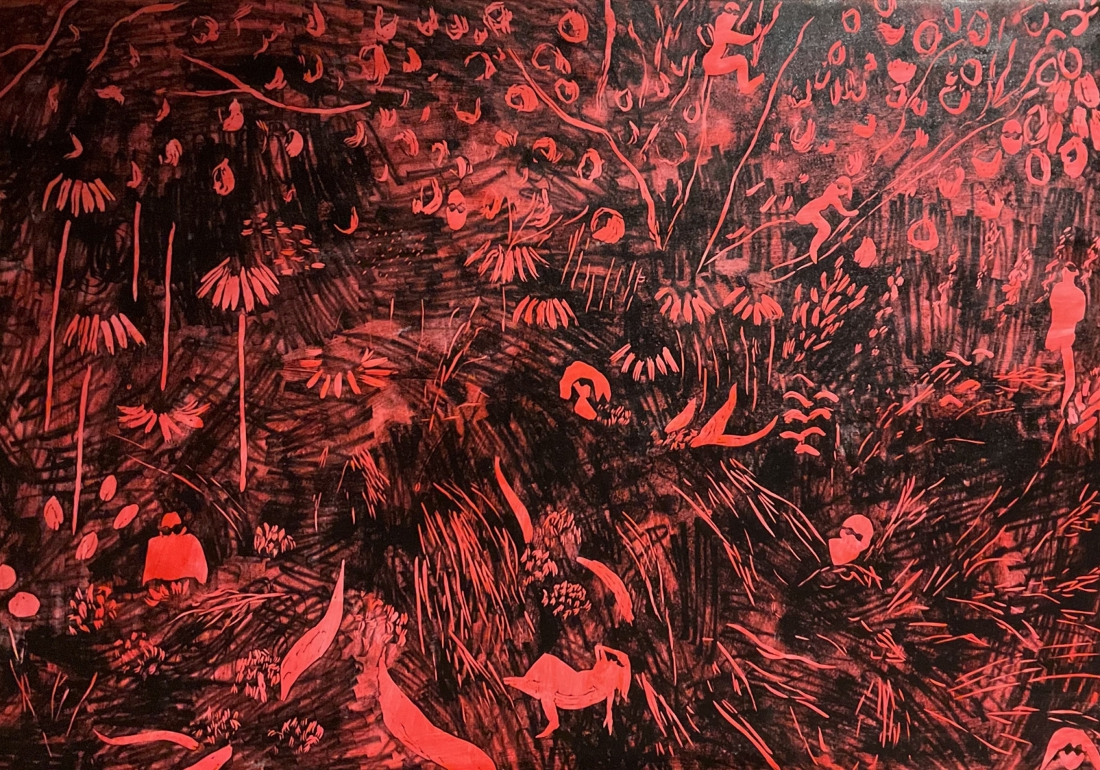 Teos kujutab metsikut aeda, kus inimesed logelevad üleolevalt, justkui turistid reisil. Nii vastandub inimese muretu kohalolu taimede ja teiste mitteinimliikide haavatavale maailmale. Kunstnik osutab hellusele mitteinimliikide vastu – tundele, mida õõnestab inimeste kohmakus omaenda võimu kasutamisel.