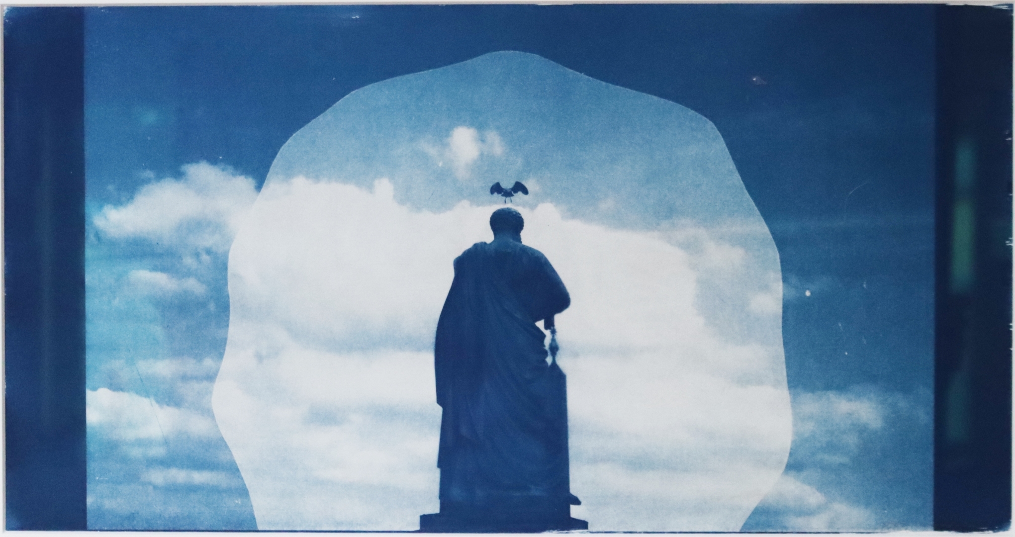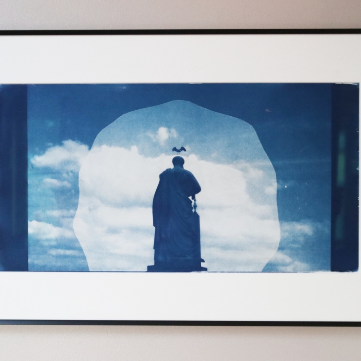 Teose loomisel olen kasutanud mitmekihilisust, Vatikanis tabatud moment Pühaku kujust kelle pealaelt tõuseb lendu kajakas. Tabatud hetk loob justkui kroonitud mehe silueti. Keskne fookus, ümar halo ümber püha mehe figuuri, taevas- kui lootuse sümbol. Avar perspektiiv ja tuleviku võimaluste vabadus. Need on teemad ja märksõnad mis pildiga kaasas käivad. Täpne tabamus lendu tõusust-kas jumalik puudutus või nali. Teos on raamitud ja omab paspartuud. Teose mõõdud: 25×48 cm, paspartuu laiius 7 cm ,must metall raam 40×63 cm, muuseumiklaasiga.