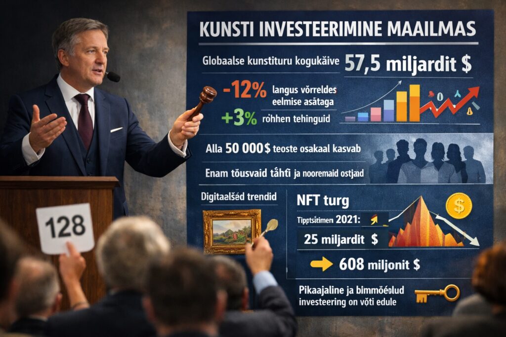 2024. aastal ulatus globaalse kunstituru kogukäive 57,5 miljardi dollarini. Kuigi see tähendas 12% langust võrreldes eelneva aastaga, kasvas tehingute arv siiski 3%. See näitab turu elujõulisust, eriti taskukohasemas hinnaklassis. Kiiresti on kasvanud alla 50 000 dollari maksvate teoste osakaal – need pakuvad investoritele väiksemat riski ja laiemat järelturgu (2).