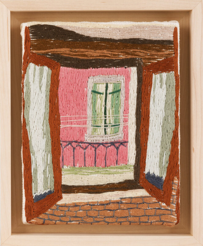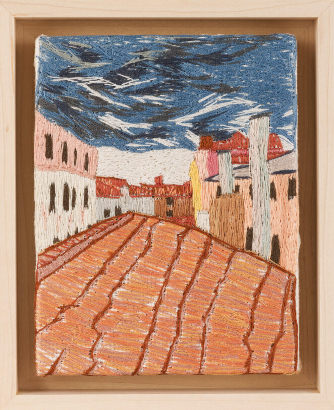 Tema tööd lähtuvad sageli fotograafilisest vaatepunktist – hetkest, mis võiks olla kiiresti fikseeritud. Kuid tikandina ei ole see enam võimalik. Iga kujutis laguneb ajas laiali ja ehitatakse uuesti üles pistehaaval. See tähendab, et vaade ei ole enam hetk, vaid kestus.