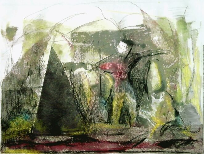 Punakas pilvemass tumedal, peaaegu öisel taustal, kannab endas maastiku või seisundi aimdust, kuid see kujund ei püsi. See ei ole stabiilne objekt, vaid pigem hetk enne lagunemist või muutumist, kus vorm hakkab allapoole lahti hargnema, muutudes pikaks rippuvaks niidistikuks, mis kaotab oma algse kujundi terviklikkuse. Kui Triin Kerge töödes aeg aeglustub ja tihendub korduse kaudu, siis Ollisaare puhul see venib lahti. Mälu ei kogune, vaid hajub, muutudes millekski, mis ei kuulu enam minevikku ega olevikku, vaid liigub nende vahel. See ei ole enam mälu kui säilitamine, vaid mälu kui võimalikkus.