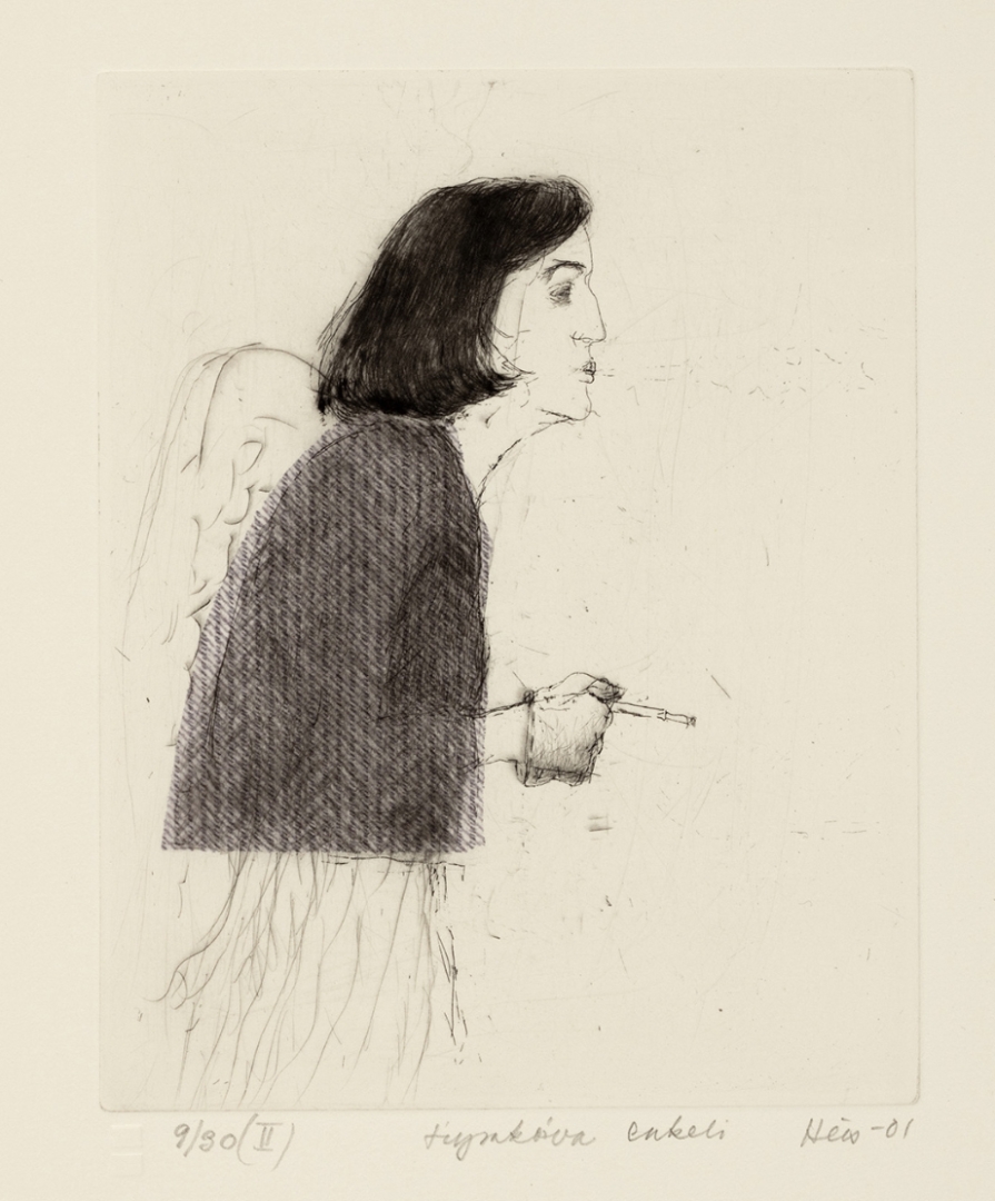 Outi Heiskanen, Smoking Angel, 2001, drypoint, etching, 45 x 37 cm framed. Photo: Jussi Tiainen