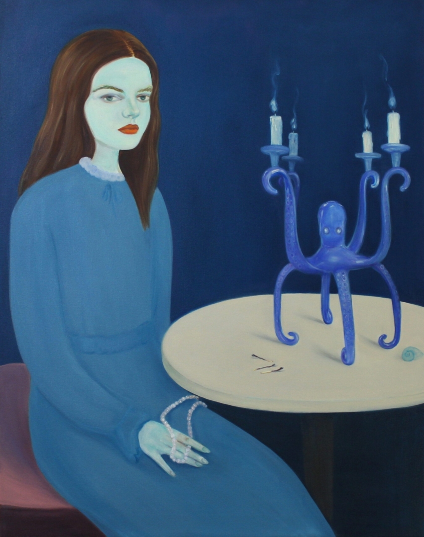 Camilla Mihkelsoo paints women who seem to have descended from outer space. They have stepped out of nostalgic science fiction films; they are like a vision of the future from the past. They arrive from a time when smoking was associated with glamour and rebellion. They want to appear independent and dangerous. In addition to women, cats often appear in the paintings. The cats’ eyes, movements, and presence fit perfectly with the mood of the works. The cats serve as a key to the inner world of the characters and are mysterious and unpredictable. They do not submit, but observe.